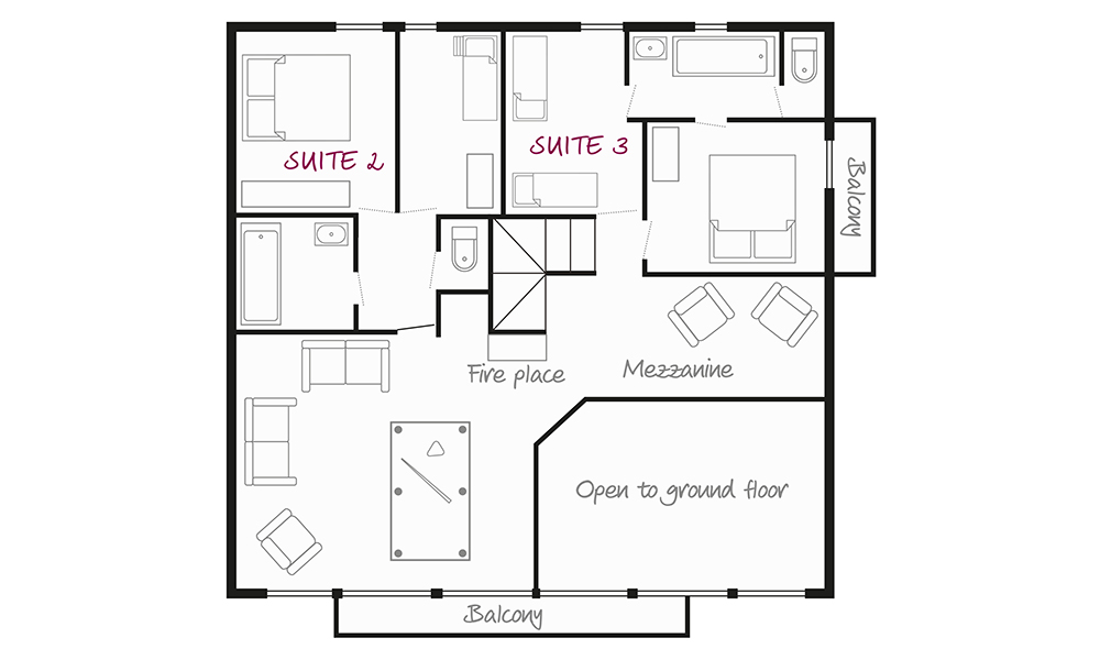 Sleeps up to 4 plus space for cot. Family suite with a beautiful, spacious room with a king size bed and walk-in wardrobe. The open-plan ensuite has a bath with a hand held shower attachment. Its windows bring natural light to the room and offer great piste views of without compromising privacy. The twin room has an ensuite with a shower and ‘his and hers’ basins.