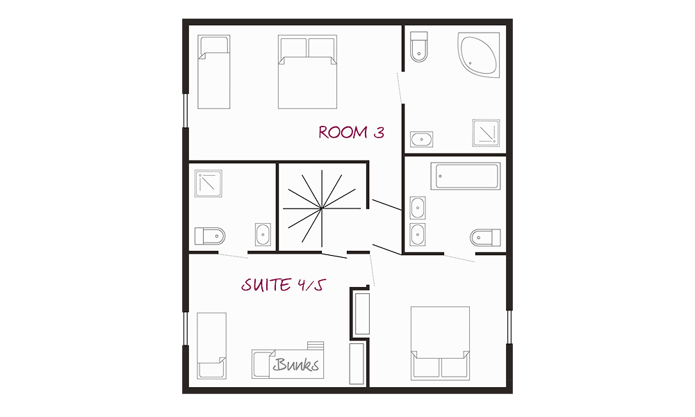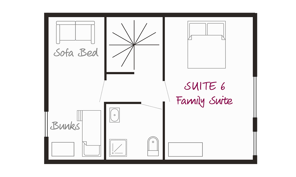 Sleeps up to 5 plus space for cot. This suite contains a bedroom with a king size bed and an ensuite with a bath. The suite has a separate bedroom with a bunk bed and single bed plus an ensuite with a shower. A sliding door connects the two bedrooms together. In exceptional circumstances, the two bedrooms can be booked separately.