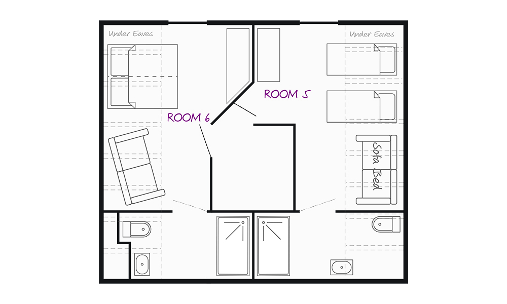 Sleeps 2 under the eaves in a twin bed with space for a cot. An ensuite with a shower. Needs to be booked with room 5.