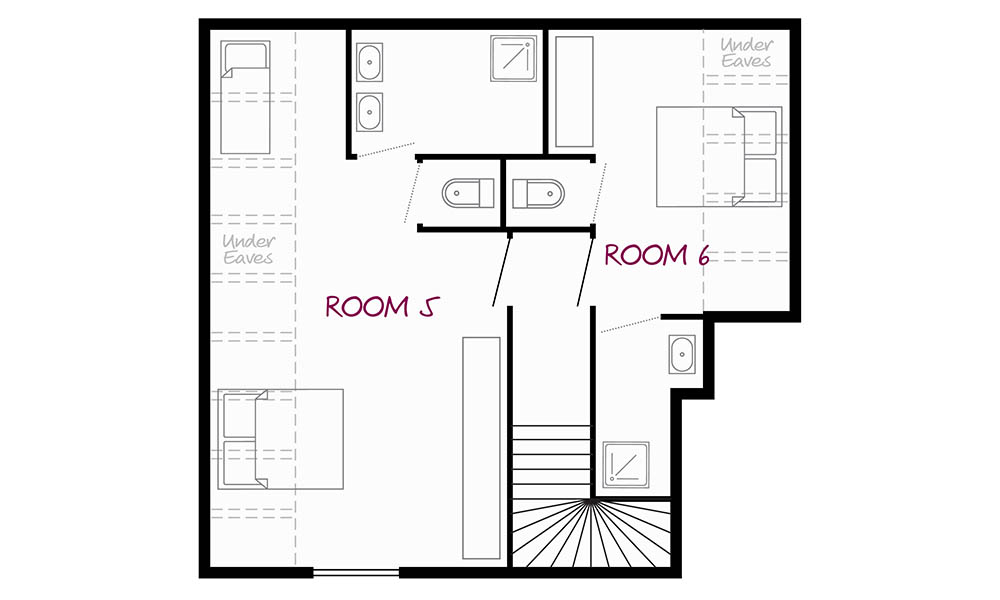Sleeps 2. A small twin room under the eaves with an ensuite bathroom containing a shower. Must be booked with room 5 for a family of up to 6.