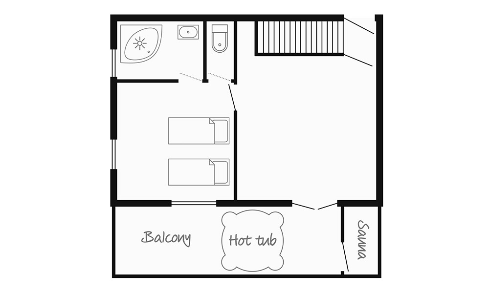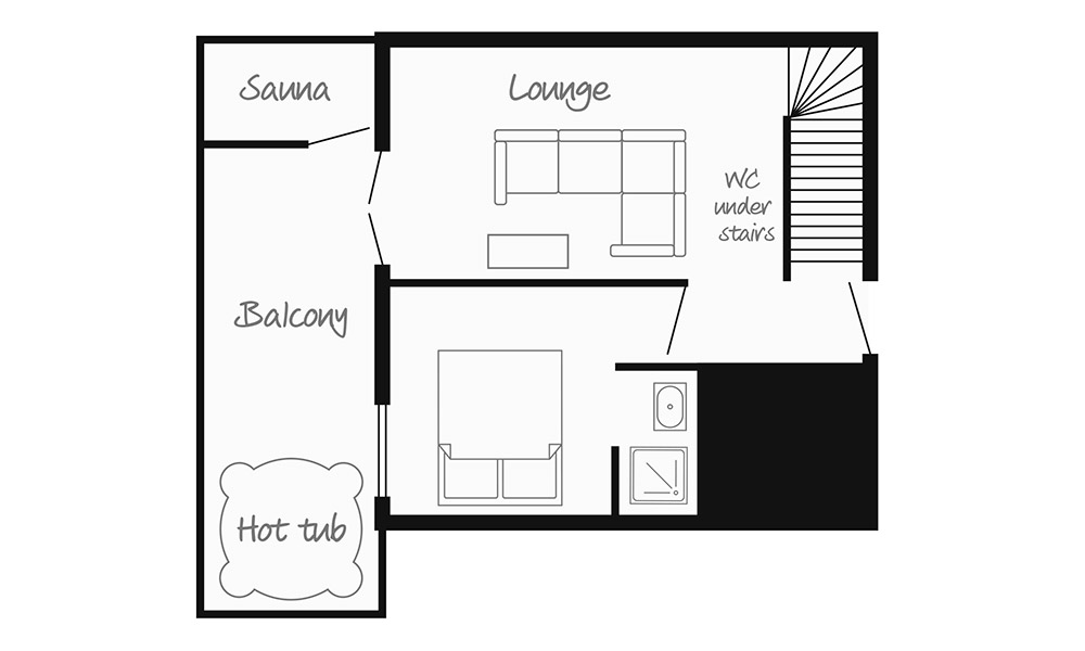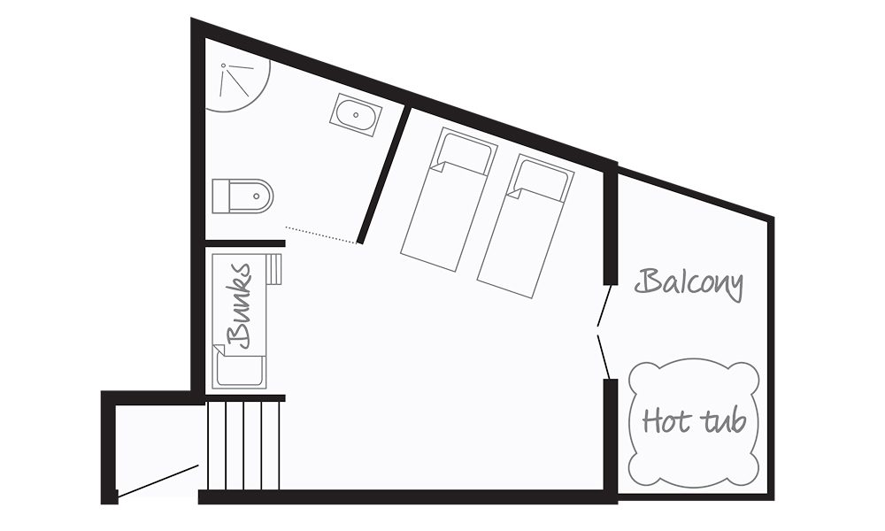 Sleeps 5 with spaces for cots. Lounge with balcony & sauna, sep wc, twin bedroom with ensuite shower, stairs to mezzanine with single bed leading to double bedroom with ensuite shower. Space for one (small) cot in each bedroom and two on mezzanine