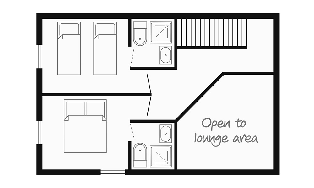 Sleeps 6. Stairs down to lounge with alcove bunk beds, two double bedrooms, each with ensuite shower room/wc