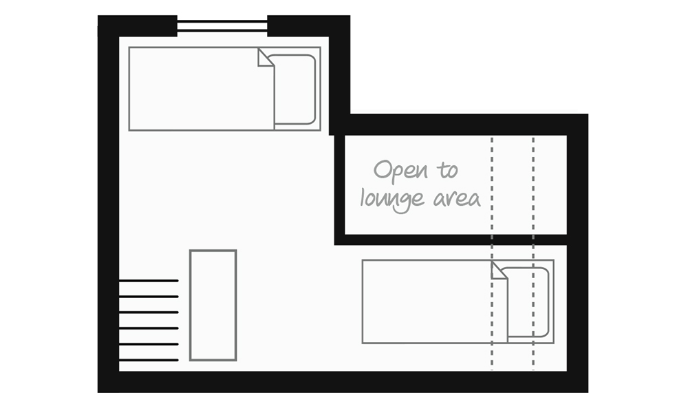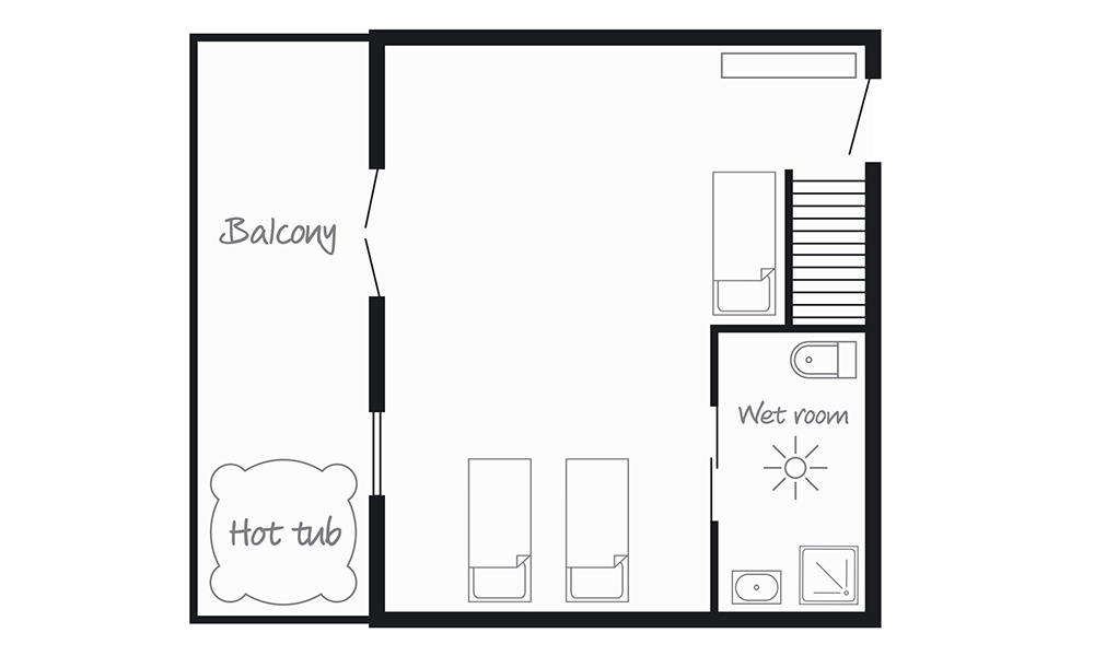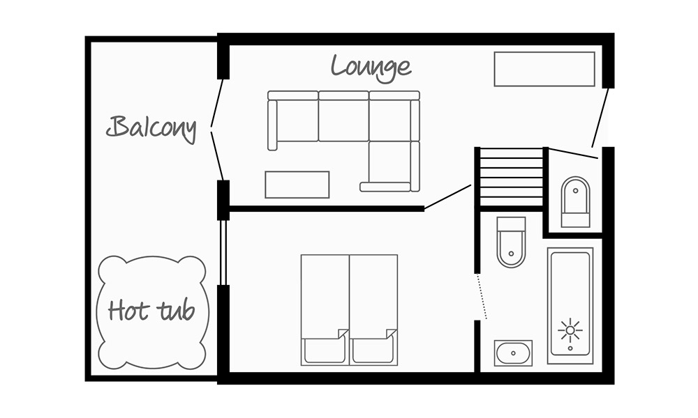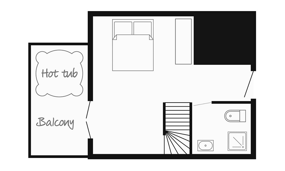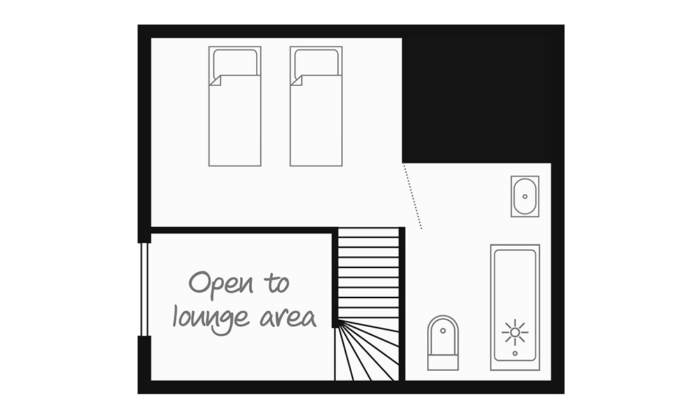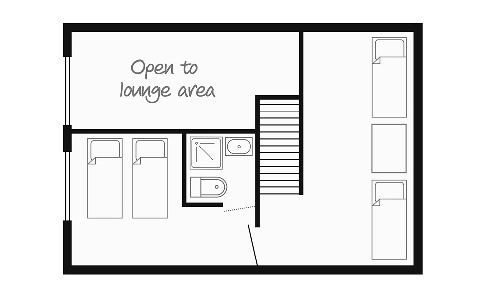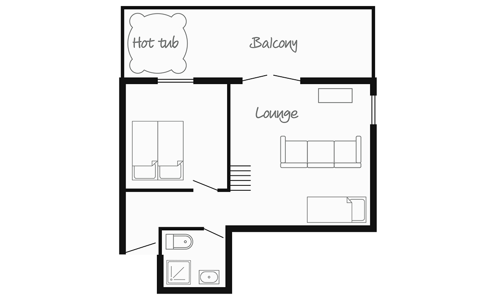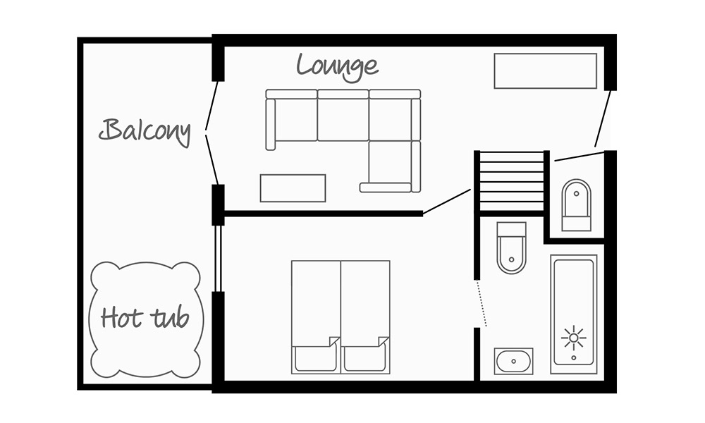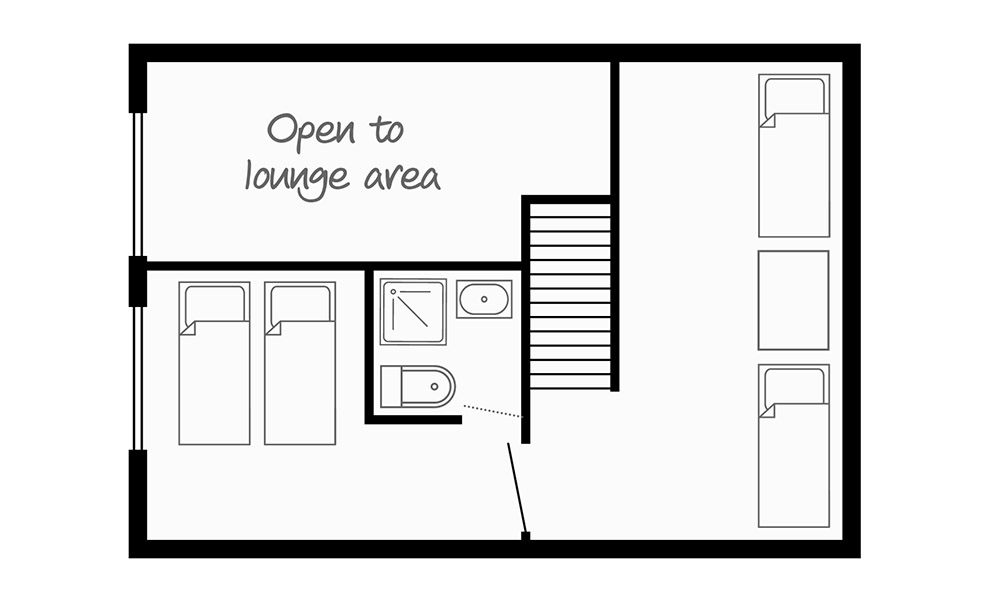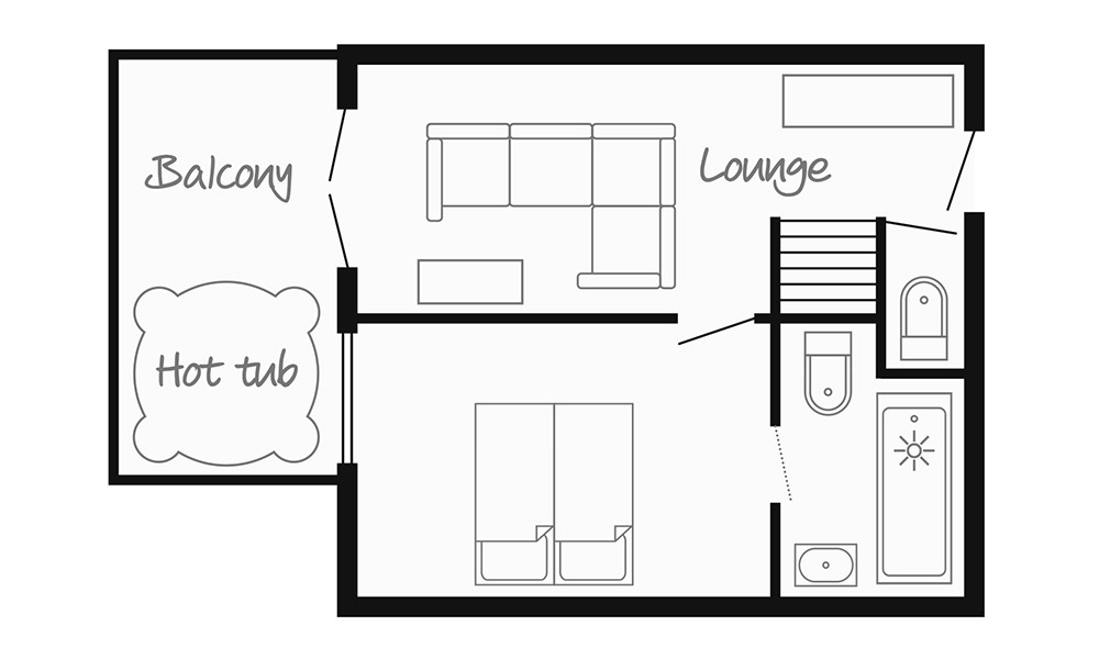 Sleeps 6 with spaces for cots. Lounge with balcony, twin beds, single alcove bed, shower room/wc (wet room), stairs to mezzanine with single alcove bed leading to double bedroom with ensuite bathroom/wc. Space for 2 cots on mezzanine. This is Disabled Accessible Room