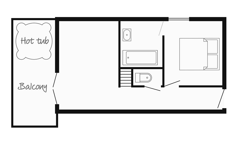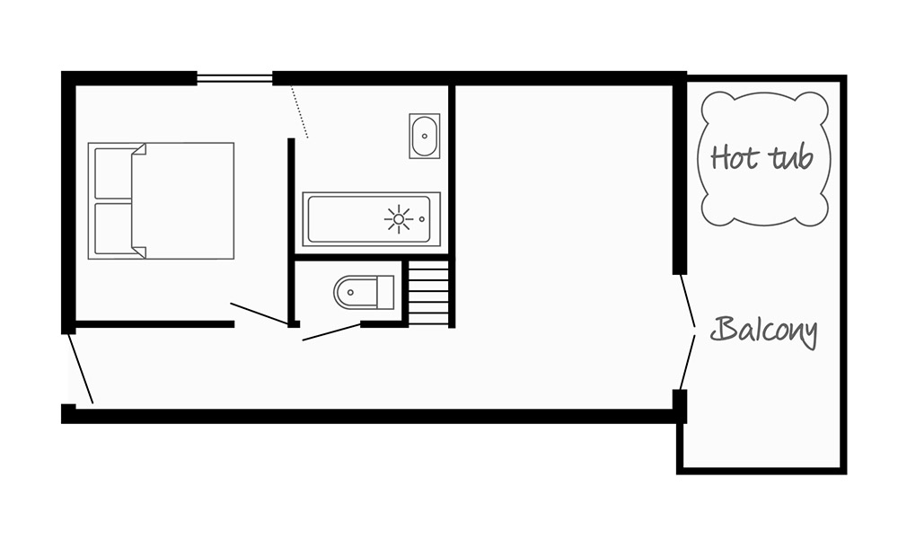 Sleeps 5. Lounge with balcony & separate wc, Double bedroom with ensuite bathroom. Steep ladder to mezzanine (only suitable for children over 6) : twin and single bed with shower & basin under eaves