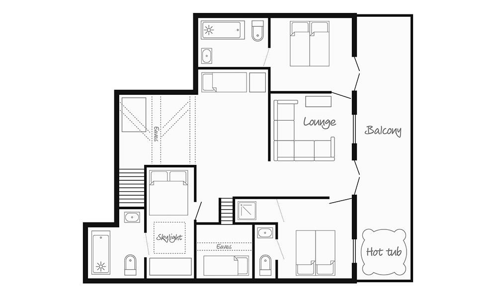 Sleeps 8 with spaces for cots. Stairs up to spacious lounge with balcony & single alcove bed, twin bedroom with ensuite bathroom/wc and space for a cot. Twin bedroom with ensuite shower room and sep wc. Double bedroom (skylight) and space for a cot with single bed under eaves and ensuite bathroom/wc. Space for 3 cots in lounge